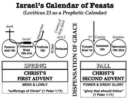 Okay, so, let us discuss the gap between Pentecost and Trumpets. During that period of June to September, the Jews had no feast days to observe. According to the Apostle Paul, our Dispensation of Grace (which began after Pentecost, in Acts chapter 9), has interrupted Israel’s program. Jesus Christ’s Second Coming is still future as is Israel’s atonement, and Christ’s Millennial Reign on earth. The first four feasts represented Christ’s First Coming, meek and lowly to Israel, and the last three feasts are a prophetic view of Christ’s Second Coming when He returns to earth in great power and glory! Wow!